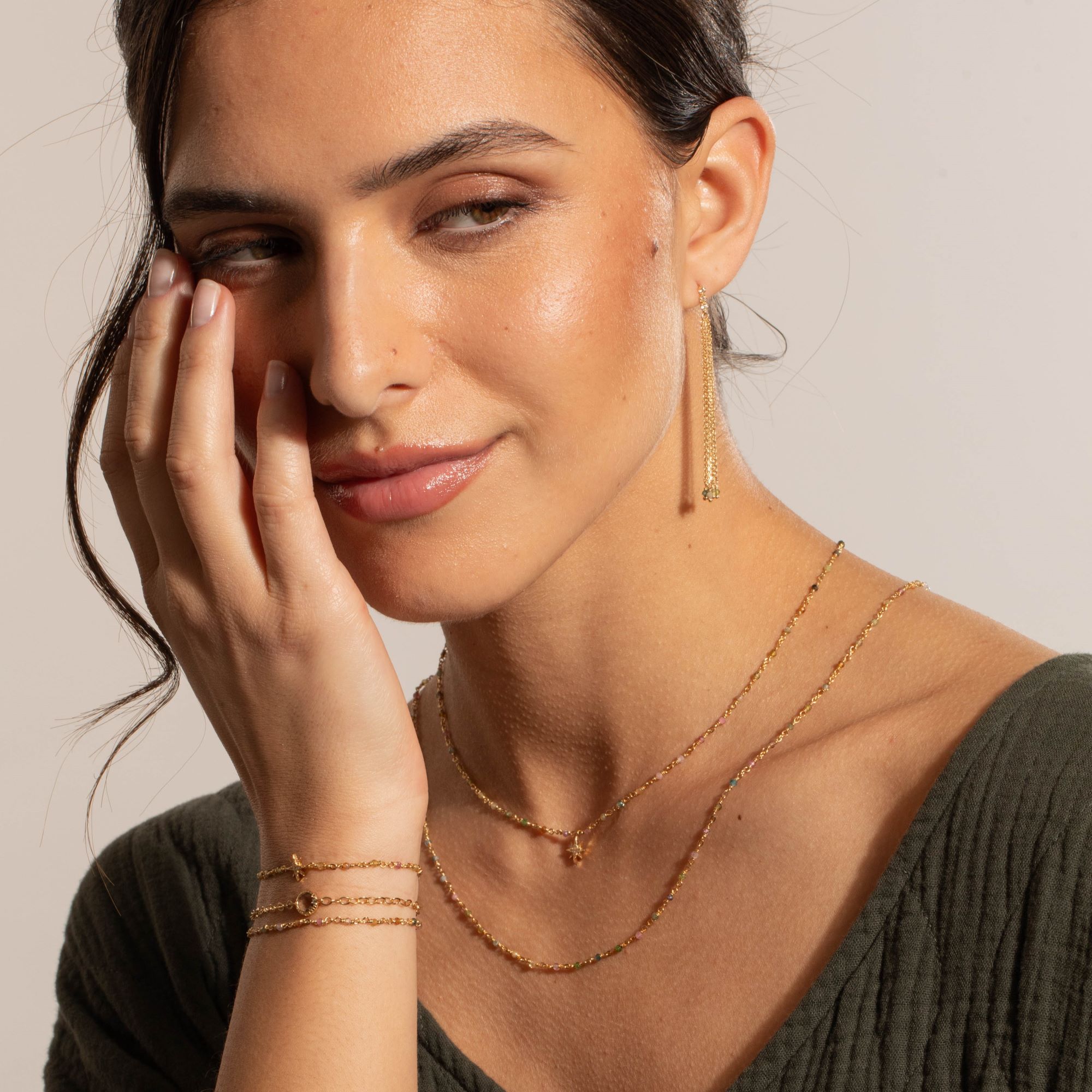 Le bracelet en argent doré double chaine avec des pierres naturelles de tourmaline et un médaillon en quartz fumé est un bijou d’exception de la collection Colors. La combinaison de la tourmaline aux couleurs vibrantes et du métal doré apporte une touche d’élégance et de sophistication à votre tenue. La tourmaline est réputée pour ses propriétés énergisantes et protectrices, vous permettant de rayonner tout au long de la journée.